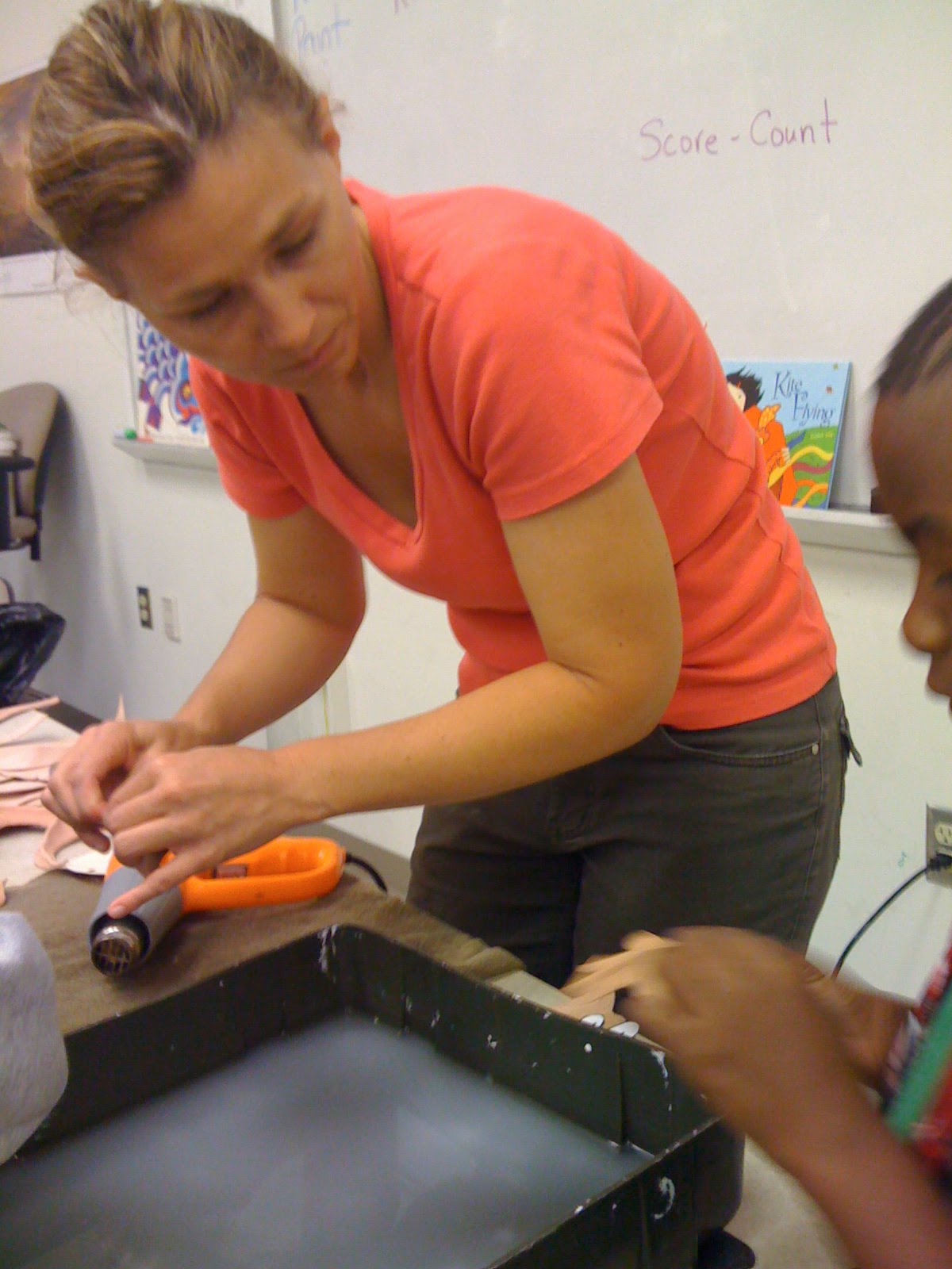 Today was all about mask making! I showed the students some of my sculptural leather masks, and we learned how to create a 3-Dimensional shape from a 2-Dimensional piece of leather using a wet form process. We talked about masks and discussed the long history masks have in our culture -- in social and religious celebrations and in theater performances. Then we experimented with methods of paper manipulation and created our own masks out of paper. We also went to the computer lab and explored digital media.